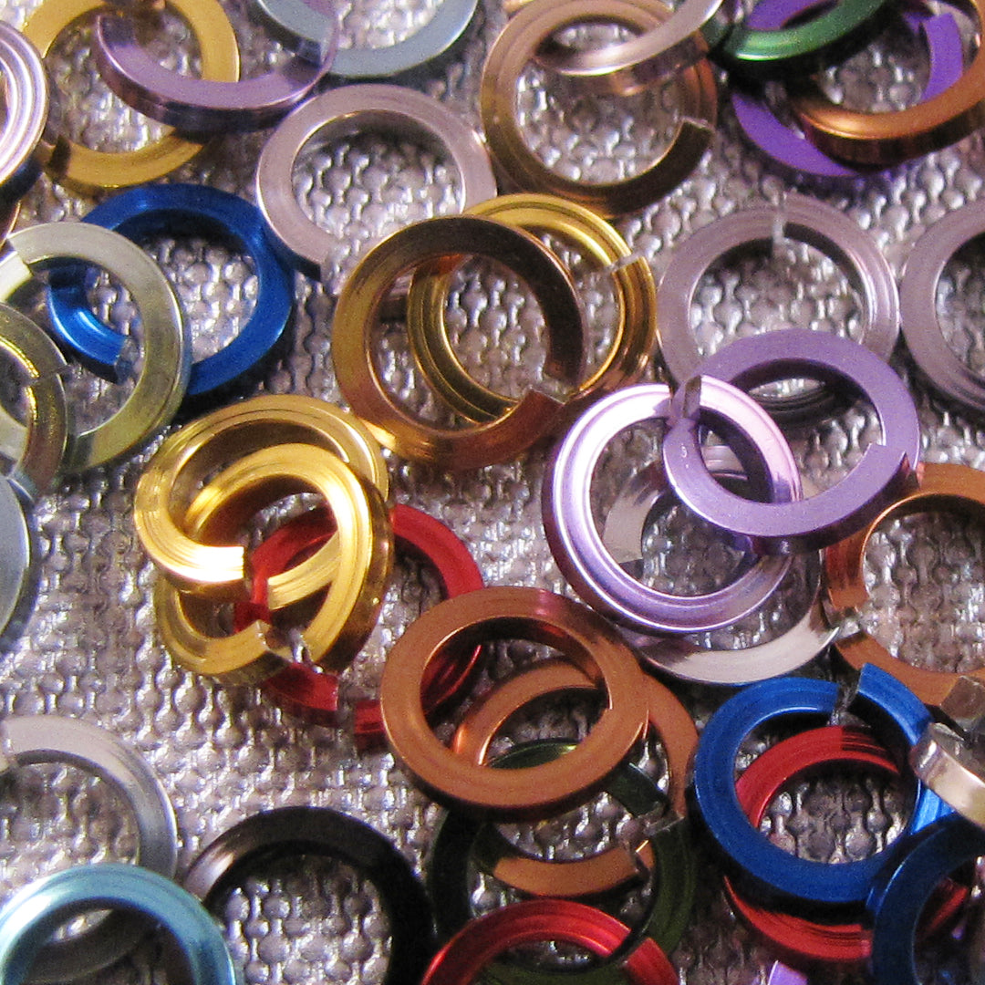 Anodized Aluminum Jump Rings do not tarnish.  The finish lasts a long time and will stand up to quite a bit of wear.  Aluminum is a very light weight but strong metal.